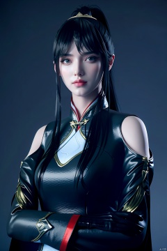 professional 3d model front view of Sean with long black hair in a high ponytail wearing a Black Hunter-Sui and  black suit ,hugging,front view of a girl with long black hair wearing  white Traditional-cheongsam,upper body,octane render, highly detailed, volumetric, dramatic lighting,Xfengqinger