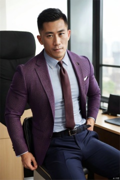jzns,1man,asian,male focus,handsome,delicate face,muscular,formal,suit,shirt,necktie,armband,belt,watch,business  pants,hand covering crotch,sitting,in office,full crotch,masterpiece,realistic,best quality,highly detailed,wak,xxh
