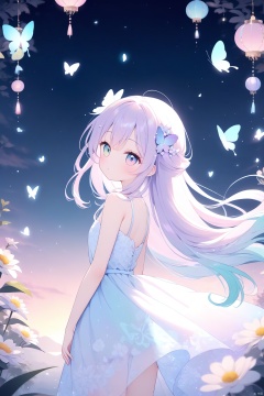 best quality,masterpiece,anime style,female character,pastel colors,flowing hair,flower accessories,whimsical,ethereal,looking back pose,large eyes,light effects,semi-transparent fabrics,playful expression,decorative patterns,fantasy,butterflies,sparkling,high saturation,vertical composition,vibrant textures,outdoor setting