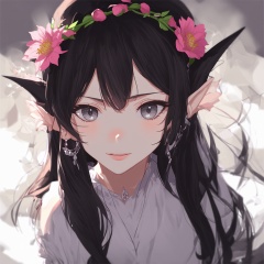Create an anime portrait of an elf girl with long, wavy hair framing her face and falling between her eyes. She looks directly at the viewer with grey eyes, a subtle blush on her cheeks, and parted lips. Her bangs are swept to the side, revealing a hair ornament and detachable sleeves. A white dress flows from her bare shoulders, adorned with intricate jewelry and a delicate head wreath featuring a pink flower. The background is blurry, allowing the subject's ethereal features to take center stage. Capture this moment in stunning 4K or 8K resolution, showcasing every detail of her piercing, hair flower, earrings, and piercing pointy ears.