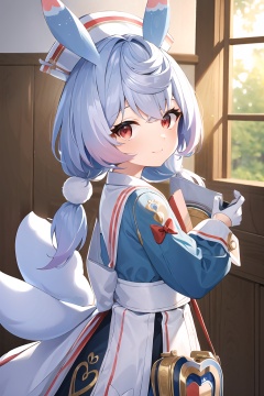 (masterpiece, best quality:1.2),insanely detailed,absurdres,ultra-highres,ultra-detailed,best quality,slender,kawaii,perfect symmetrical face,ultra cute girl,ultra cute face,ultra detailed eyes,ultra cute,ultra beautifu,<lora:sigewinneT-000008:1>,sigewinne \(genshin impact\),1girl,solo,animal ears,back bow,looking at viewer,book,short twintails,smile,red eyes,hat,rabbit tail,blue hair,long sleeves,white gloves,dress,white headwear,closed mouth,holding,apron,vision \(genshin impact\),white apron,bow,book stack,looking back,pom pom hair ornament,indoors,nurse cap,blurry background,from behind,heart satchel,upper body,gloves,