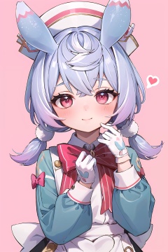 (masterpiece, best quality:1.2),insanely detailed,absurdres,ultra-highres,ultra-detailed,best quality,slender,kawaii,perfect symmetrical face,ultra cute girl,ultra cute face,ultra detailed eyes,ultra cute,ultra beautifu,<lora:sigewinneT-000008:1>,sigewinne \(genshin impact\),1girl,solo,white gloves,bow,red eyes,blue hair,looking at viewer,white headwear,smile,heart,animal ears,short twintails,simple background,hat,closed mouth,pink background,long sleeves,red bow,dress,upper body,bowtie,pink bow,pink bowtie,spoken heart,white apron,blush,vision \(genshin impact\),gloves,