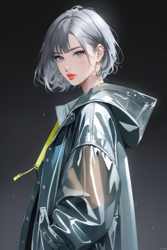 asterpiece,(masterpiece, top quality, best quality),solo, 1girl, earrings, jewelry, black background, hood, looking at viewer, hood up, simple background, cowboy shot, see-through, hand in pocket, jacket, short hair, bag, coat, raincoat, long sleeves, lips, multicolored hair, hoop earrings, grey eyes