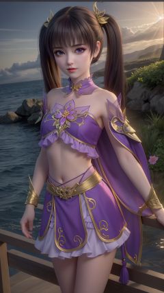 <lora:ZY_20240410125751-000007:0.5>,ZY,1girl,twintails,solo,black hair,skinny body,pale skin,skinny,(purple eyes:1.2),hair ornament,realistic,closed mouth,bangs,looking at viewer,portrait,bare_legs,cleavage,Giant breasts,1girl,twintails,solo,skirt,brown hair,long hair,looking at viewer,midriff,water,sky,hair ornament,sunset,bare shoulders,ocean,cloud,brown eyes,outdoors,navel,standing,bangs,flower,lips,black hair,cowboy shot,railing,cape,bracelet,cloudy sky,purple skirt,smile,jewelry,miniskirt,crop top,horizon,sun,sexy,seduce,naked,(fullbody,Long distance shot),cinematic lighting,glowing point,<lora:HDR:0.5>,<lora:MHB:0.3>,