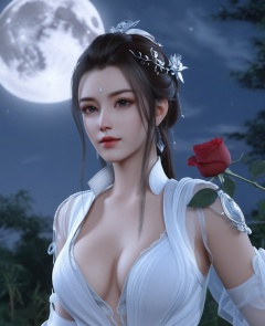 <lora:612-DA-XL-少年白马醉春风-玥瑶:0.8>(,1girl, ,best quality, ),looking at viewer,masterpiece, (( , )),, realistic,science fiction,mole, ultra realistic 8k cg, full moon,  rose,(cleavage), (),