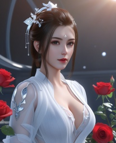 <lora:612-DA-XL-少年白马醉春风-玥瑶:0.8>(,1girl, ,best quality, ),looking at viewer,masterpiece, (( , )),, realistic,science fiction,mole, ultra realistic 8k cg, sun ,  rose,(cleavage), (),
