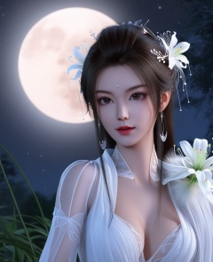<lora:612-DA-XL-少年白马醉春风-玥瑶:0.8>(,1girl, ,best quality, ),looking at viewer,  ,,ultra detailed background,ultra detailed background,ultra realistic 8k cg, ,masterpiece, spider lily,full moon, (cleavage), (),