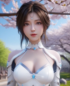 <lora:613-DA-XL-神印王座-白玥:0.8>(,1girl, ,best quality, ),looking at viewer,  ultra detailed background,ultra realistic 8k cg,ultra detailed 8k cg,masterpiece,upper body,  (( , )),, ,science fiction,mole, ultra realistic 8k cg, ,    ,outdoors, sun,sunlight, cherry blossoms,      (cleavage), (),