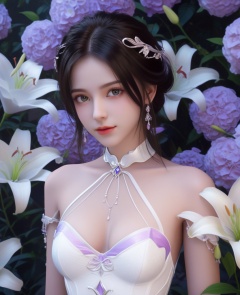 <lora:613-DA-XL-神印王座-白玥:0.8>(,1girl, ,best quality, ),looking at viewer,  ,ultra detailed 8k cg,ultra detailed background,ultra realistic 8k cg,1girl, solo,(bare shoulders:0.85),(masterpiece, best quality),((oil painting style)),sexy young lady,(beautiful face and eyes),(upper body:1.5),(whole body:1.05),(single person:1.2),surrounded by flowers, (lily), roses, floret, vegetation, white, purple, purplish pink,Impressionism,colorful,(Breast size:1.3),(cleavage),