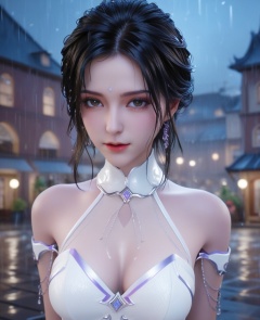 <lora:613-DA-XL-神印王座-白玥:0.8>(,1girl, ,best quality, ),looking at viewer,masterpiece, (( , )),,ultra realistic 8k cg, ,      ,building, bare_shoulders,cleavage cutout, eyelashes,magic,hydrokinesis,sweat, wet, rain, ,       (cleavage), (),