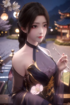 Upper body, panoramic view, exploring cherry blossom branches, fairyland, light blue elements, night, side light shining on the face,Xlujiejie,Xyunxi, Xlongnv, Yunxiao_Fairy,Xtianhu