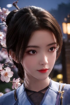 Upper body, panoramic view, exploring cherry blossom branches, fairyland, light blue elements, night, side light shining on the face,Xlujiejie,Xyunxi, Xlongnv, Yunxiao_Fairy,Xtianhu,depth of field