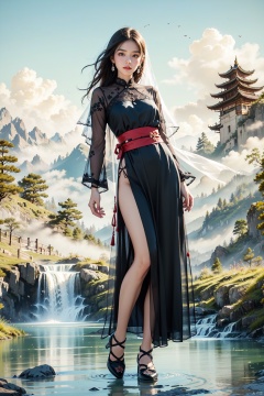 Vistas: The Outlines of pavilions are faintly visible, depicted in light ink and fine brushwork. The sky is shrouded in clouds and rendered in light ink, adding a layer of fantasy and mystery to the whole scene. Middle scene: Peaceful bamboo forest. An ancient bridge quietly straddles the water, its outline outlined in ink and the water rendered in light ink. Close up: The girl is standing, her eyes clear and deep, with light ink. Delicate eyebrows. Open your lips slightly. Rosy face, rendered in light ink. The hair was thick and shiny, and the dark black hair fell like a waterfall. Wearing a soft satin dress, the shine and flow of the dress were expressed through different shades of ink. Around his waist was an embroidered sash, embroidered with delicate patterns. Wearing a veil of light. Embroidered shoes on the feet, the pattern on the upper is depicted with fine brushstrokes. (Atmospheric view, panoramic view, whole body), ananmo,山水如画,1girl,mountain