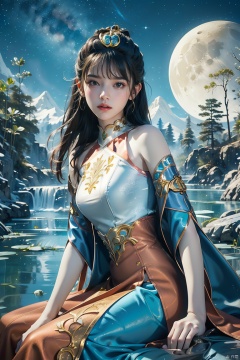 masterpiece,best quality,official art,extremely detailed CG unity 8k wallpaper,realistic,light rays,light particles,1girl,earrings,solo,jewelry,black_hair,long_hair,upper_body,blue_eyes,blue_ribbon,armlet,breasts,blue theme,starry background,scenery,starry sky,night,reflection,night sky,outdoors,milkway,cistern,(lotus:1.2),lake water,moon,long_hair,earrings,hair_ornament,dynamic pose,looking at viewer,cowboy shot,sitting,mountain, Light master