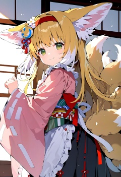 score_9,score_8_up,score_7_up,source_anime BREAK <lora:Suzuran_pony:1>,1girl,solo,suzuran,tails,multiple tails,animal ear fluff,animal ears,blonde hair,green eyes,tails,multiple tails,looking at viewer,smile,closed mouth,, yukibare,long hair,hair ornament,hair flower,red hairband,japanese clothes,pink kimono,black hakama,wide sleeves,apron,obi