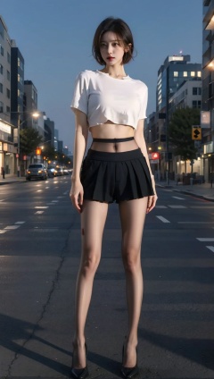((masterpiece)),best quality,perfect anatomy,8K wallpaper,mWaistSilk,1girl,pantyhose,white shirt,short hair,crop top,full body,standing on street,night,<lora:mWaistStockings:0.8>,
