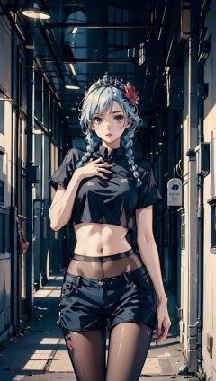 ((masterpiece)),best quality,perfect anatomy,8K wallpaper,mWaistSilk,pantyhose,shirt,crop top,1girl,hair_flower,twin braids,tiara,cowboy_shot,standing in tunnel,<lora:mWaistStockings:0.7>,