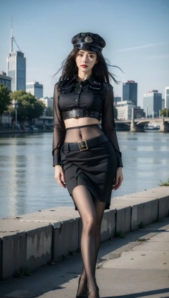 ((masterpiece)),best quality,perfect anatomy,8K wallpaper,mWaistSilk,pantyhose,crop top,1girl,police_uniform,police hat,pencil skirt,short skirt,belt,long hair,dynamic poses,riverbank,<lora:mWaistStockings:0.7>,