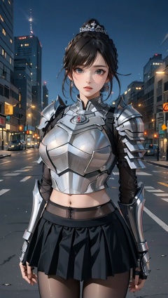((masterpiece)),best quality,perfect anatomy,8K wallpaper,mWaistSilk,1girl,braided ponytail,pantyhose,tiara,armored,breastplate,crop top,cowboy_shot,city,night,<lora:mWaistStockings:0.9>,