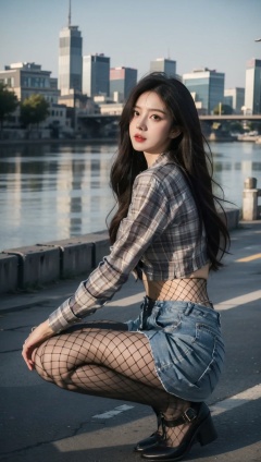 ((masterpiece)),best quality,perfect anatomy,8K wallpaper,mWaistSilk,1girl,denim skirt,long hair,outdoors,plaid shirt,black hair,fishnet pantyhose,fishnets,blue skirt,crop top,long sleeves,squatting,<lora:mWaistStockings:0.7>,