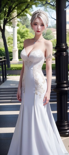 lingmeier, 1girl, solo, looking at viewer, wedding dress , white hair, cowboy_shot, realistic,masterpiece,best quality
