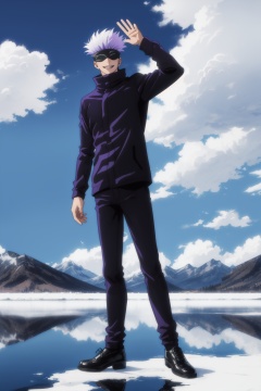 <lora:Satoru-000015:0.9>,Satoru CYQL,1boy,looking at viewer,solo,male focus,white hair,short hair,spiked hair,covered eyes,black blindfold,blindfold,jacket,black jacket,pants,black pants,long sleeves,smile,black footwear,high collar,shoes,portrait,front view,On clear days, the salt lake becomes a colossal mirror, reflecting the sky and clouds above. White salt flats stretching towards distant mountains paint a surreal scene,beautiful detailed sky,beautiful detailed glow,posing in front of a colorful and dynamic background,masterpiece,best quality,beautiful and aesthetic,wallpaper,
