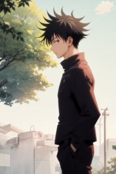<lora:Fushiguro-000016:0.9>,Fushiguro CYQL,1boy,looking at viewer,solo,male focus,black hair,short hair,spiked hair,black eyes,school uniform,pants,jacket,long sleeves,profile,from_side,Tall bamboo stalks stand upright in close proximity, their leaves rustling softly in the breeze, while sunlight filters through the gaps, casting dappled shadows,beautiful detailed sky,beautiful detailed glow,masterpiece,best quality,beautiful and aesthetic,wallpaper,