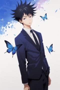 <lora:Fushiguro-000016:0.9>,Fushiguro CYQL,1boy,looking at viewer,solo,male focus,black hair,short hair,spiked hair,black eyes,midnight blue tuxedo, black dress shirt, velvet bow tie, patent leather loafers,cowboy_shot,foreshortening,Late spring into early summer, hillsides burst with a profusion of blooming flowers, a kaleidoscope of colors, bustling with bees and butterflies,beautiful detailed sky,beautiful detailed glow,masterpiece,best quality,beautiful and aesthetic,wallpaper,