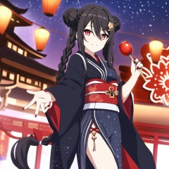 masterpiece,best quality,Amazing,(1girl),🖐️,extremely detailed CG unity 8k wallpaper,illustration,finely detail,Depth offield,(beautiful detailed girl),beautiful detailed glow,(golden ratio),(beautiful detailed eyes),(beautiful detailed face),(beautiful detailed calf),beautiful detailed hands,aiming at viewer,(highres),small breasts,very long hair,disheveled black hair,(beautiful detailed clothes),(( bright red eyes)),long bangs,hairs between eyes,smile,solo,kimono,japanese_clothes,double_bun,hair_ornament,yukata,nail_polish,obi,hairclip,braid,holding candy_apple,firework,lighting,beautiful detailed sky,star sky,<lora:PCRcutain:0.8>,