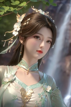masterpiece,best quality,official art,extremely detailed CG unity 8k wallpaper,1girl, upper body, purple hair, light rays, light particles, waterfall, tree, clover,,(big breasts:1.59),  ,Xfengqinger,Xxiyouqin,Xliushen,X-Hydrangea,XyunxiPVC, song_hanfu, New Chinese_Hanfu