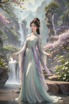 masterpiece,best quality,official art,extremely detailed CG unity 8k wallpaper,1girl, upper body, purple hair, light rays, light particles, waterfall, tree, clover,,(big breasts:1.59),  ,Xfengqinger,Xxiyouqin,Xliushen,X-Hydrangea,XyunxiPVC, song_hanfu, New Chinese_Hanfu, traditional chinese ink painting