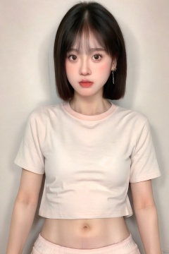 1girl, high quality,  looking at viewer,  shorts, t-shirt, skin tight,  thin, blush, upper body, navel,GXgirl, ,moyou