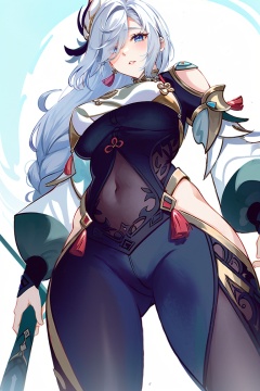 ((HRD, HUD, 8K)),((masterpiece, best quality)), highly detailed, soft light,ShenHe, 1girl, solo, shenhe (genshin impact), breasts, hair over one eye, weapon, long hair, blue eyes, bodysuit, large breasts, covered navel, looking at viewer, breast curtain, polearm, hair ornament, hip vent, bangs, thighs, white hair, black bodysuit, parted lips, braided ponytail, from below, tassel, clothing cutout, puffy long sleeves, long sleeves, very long hair, gloves, braid, shoulder cutout,  <lora:20240630-1719732786968:0.8>