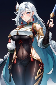 ((HRD, HUD, 8K)),((masterpiece, best quality)), highly detailed, soft light,ShenHe, 1girl, solo, shenhe (genshin impact), long hair, weapon, blue eyes, breasts, braid, hair over one eye, hair ornament, bodysuit, covered navel, breast curtain, polearm, braided ponytail, looking at viewer, holding, very long hair, tassel, large breasts, gloves, holding weapon, white hair, hip vent, shoulder cutout, black bodysuit, bangs, clothing cutout, partially fingerless gloves, parted lips, black background, cowboy shot, gold trim, black gloves, tassel earrings, blush, holding polearm, puffy sleeves, jewelry, earrings, standing, single braid, thighs, <lora:20240630-1719732786968:0.75>