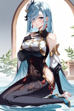 ((HRD, HUD, 8K)),((masterpiece, best quality)), highly detailed, soft light,ShenHe, 1girl, breasts, shenhe (genshin impact), solo, hair over one eye, long hair, large breasts, hair ornament, dress, looking at viewer, wariza, water, sitting, cleavage, clothing cutout, bare shoulders, black dress, blue eyes, nail polish, leaf, blue nails, detached sleeves, long sleeves, blue hair, hand on own chest, thighs, bangs, closed mouth, tassel, cleavage cutout, chinese clothes, gold trim, very long hair, <lora:20240630-1719732786968:0.75>