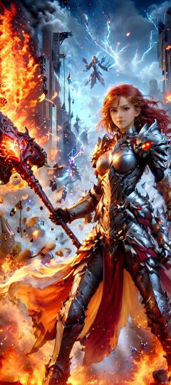 1 girl, Flame body, masterpiece, top quality,phoenix dark is x-men, beautiful and aesthetic:1.2, (1girl:1.3), (full body:1.5),red suitbody ,looking at viewer,fire hair, extreme detailed,(fire hands:1.5),fire,smoke,goddess, detailed, detail fingers, detail face, masterpiece,ultra realistic,32k,extremely detailed CG unity 8k wallpaper, best quality, Cinematic photography, movie mood, cinematic light, compelling composition, storytelling elements, conveys emotion, mood, and narrative depth, creating visually striking images that feel like still frames from a film, Cinematic portrait photography, capture subject in a way that resembles a still frame from a movie, cinematic lighting, story, narrative quality, drawing viewers into the scene and evoking a sense of cinematic immersion, capturing emotion, professional, engaging, compelling composition, night photography, nocturnal beauty, city lights, starry skies, celestial wonders, moonlit landscapes, urban glow, capturing the essence of darkness, ethereal atmosphere, dramatic shadows, magical ambiance, long exposure techniques, expert use of light sources, Heavenly Breasts,COLORFUL GRADIENT,score_9_up score_8_up score_7_up,DAMIMI,Spear and Shield,UTASHIMADG fishnets mecha leotard armor, HKMAGIC,Wearing fist gauntlets, HKSTYLE,MECHA ANGEL SOLDIER,((Hold spear and Shield:1.5)),Wielding battlehammer,HKMECHA,FBB,((cinematic film still multiple views)),