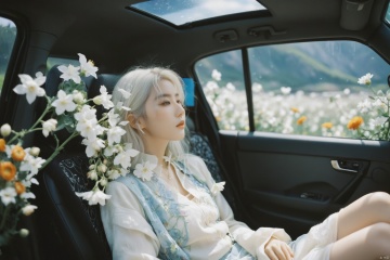 breathtaking ethereal fantasy concept art of cinematic film still,chinese girl,a girl with white hair sitting in car filled with flowers,art by Rinko Kawauchi,in the style of naturalistic poses,vacation dadcore,youth fulenergy,a cool expression,body extensions,flowersin the sky,****og film,super detail,dreamy lofi photography,colourful,covered in flowers andvines,Inside view,shot on fujifilm XT4 . shallow depth of field,vignette,highly detailed,high budget,bokeh,cinemascope,moody,epic,gorgeous,film grain,grainy . magnificent,celestial,ethereal,painterly,epic,majestic,magical,fantasy art,cover art,dreamy,monkren, . award-winning, professional, highly detailed, light master, monkren, sunlight