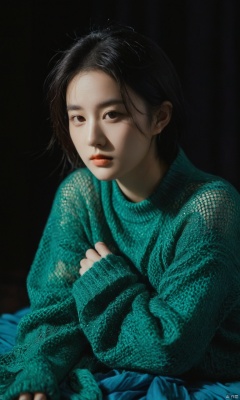 Surrealist art chinese girl,18yo,Portrait Studio,facial,official art,photographic lights,warm light,black background,realistic,solo,Sony A7R IV with Sony FE 85mm f-1.4 GM,Agfa Vista 400,green sweater,a blue blanket,surrealistic,16k image quality,sparse mesh sweater, . Dreamlike, mysterious, provocative, symbolic, intricate, detailed