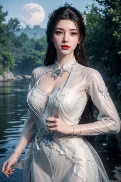 (8k, RAW photo, best quality, masterpiece:1.2), (super realistic, photo-realistic:1.3), ultra-detailed, extremely detailed cg 8k wallpaper, hatching (texture), skin gloss, light persona, (crystalstexture skin:1.2), (extremely delicate and beautiful), ultra-high resolution, (photo realistic: 1.4), Surrealism, Fantastical verisimilitude, beautiful blue-skinned goddess Phoenix Peacock on her head, fantastical creation, thriller color scheme, surrealism, abstract, psychedelic, 1 girl, flower,(translucent white gauze dress:1.3), (moon), moonlight, water surface, long hair, windy, qingyi, ll-hd, pf-hd, ty-hd, lmw-hd,Xlimuwan, Xmedusa,Yunxiao_Fairy,,(big breasts:1.39)