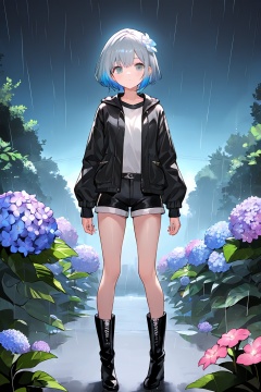 1girl, solo, flower, jacket, short_hair, black_jacket, neon_lights, standing, outdoors, black_footwear, blue_hair, hydrangea, long_sleeves, closed_mouth, boots, rain, shorts, shirt, grey_hair, white_flower, black_shorts,