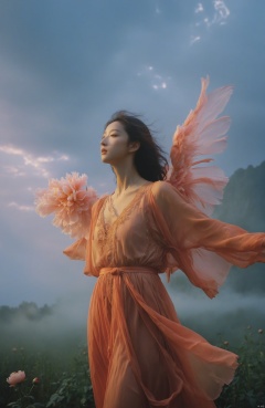 imagine Sublime dreamscape portrait by Gregory Crewdson,delicate Chinese sylph levitating amid surreal cloudscapes of windswept scarlet chiffon and ephemeral feathered wings composed of soft drifting peony petals,serene high renaissance countenance haloed in rays of copper-tinged dawn light,spellbinding emotional narrative exploring the poetic boundaries of the surreal,8K,