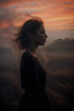 made of fog, In the style of Kodak Film Grain Photography, we capture a moment suspended between light and shadow, where a beautiful woman stands enveloped in the peculiarities of a surreal landscape. The wind whispers secrets through her hair, accentuating her solitude in this vast, undefined space. Around her, the juxtaposition of glaring light and deep shadows carves out a scene filled with nostalgia and a haunting sense of memory. This image, rich in grain and texture, evokes a profound sense of longing, a yearning for moments lost to time. The air is thick with the essence of reminiscence, each particle of film grain a testament to the fleeting nature of beauty and life itself. It's a portrait of isolation in a crowded world, a study in the art of capturing the ephemeral, where every detail, from the subtle sway of her silhouette against the gusts to the intricate play of light dancing across her visage, tells a story of beauty, eeriness, and the solitary journey through the landscapes of memory.