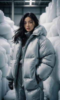 film photography aesthetic, In the photo, an Asian woman, likely in her 30s, inside an industrial freezer warehouse, wearing thick puffy down jacket, wearing thick puffy down pants, thick puffy down suit, direct and engaging gaze, long black hair cascading over her shoulders, clean and minimal background enhancing focus on the model, snow and ice covering everything, frost, ice, high-resolution image capturing fine details., Vibrant, whimsical