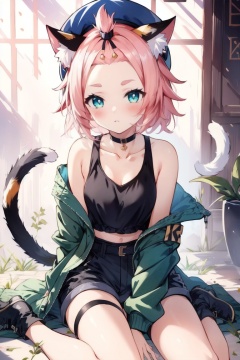 ((HRD, HUD, 8K)),((masterpiece, best quality)), highly detailed,Diona, 1girl, animal ears, diona (genshin impact), tail, solo, green jacket, jacket, cat tail, forehead, bangs pinned back, shorts, pink hair, hat, cat ears, animal ear fluff, looking at viewer, shirt, green eyes, blush, sitting, long sleeves, collarbone, open jacket, choker, thigh strap, black shorts, thick eyebrows, closed mouth, open clothes, beret, between legs, hand between legs, cat girl, black choker, off shoulder, short hair, short shorts, short eyebrows, black shirt, character name, wariza, ribbon, blue shorts, <lora:20240701-1719821584874:0.75>