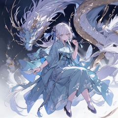 jinhsi,1girl,white hair,bule | white | gray eyes,hair bangs,Ring,one mole under right eyes,dragon,full body,hanfu,tang style outfits,