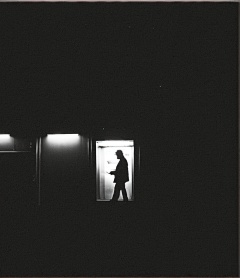 The image is a high-contrast night scene focusing on a solitary figure interacting with a brightly lit object,presumably an ATM or ticket machine,outdoors,silhouetted person,dark surroundings illuminated by a single light source,atmospheric,upper-body visible,male,nondescript clothing,urban setting,sense of solitude,cool color tones,ambient street lighting,high contrast,voyeuristic perspective,taken from a high angle,through a frame-like structure that adds depth,mysterious mood,likely taken with a telephoto lens,not possible to determine age or race,art style or photograph seems naturalistic and candid,not staged,inspired by street photography aesthetics,average to high quality,