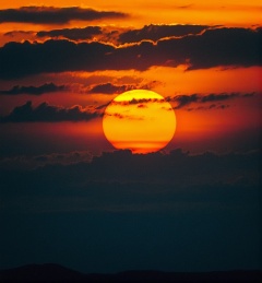Majestic sunset with the sun engulfed in clouds,vivid orange and black color palette,silhouette of the horizon,atmospheric mood,warm tones,centered composition,prominent sun with visible solar texture,possibly captured with a telephoto lens,minimalist aesthetic,inspired by natural landscape photography,high quality,