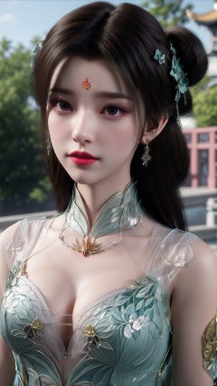 1girl, dress, forehead mark, hair rings, black hair, green dress, hair ornament, facial mark, chinese clothes, mischevious smile, perfect body, scenery, sharp focus, best quality, masterpiece, detailed outfit, illustration, perfect eyes, finely detailed beautiful anime eyes, realistic skin, intricate details, best lighting, depth of field, ultra high resolution,cowboy_shot, dynamic pose, dynamic angle,Xchengling,(big breasts:1.23),Xlimuwan,Xyunxi,xhuolinger,Xlujiejie,X-Hydrangea