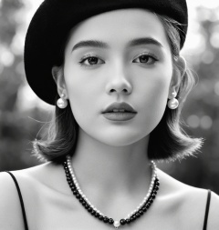 Gray,Monochrome,(black-and-white photograph:1.5),,,black-and-white photograph,1girl,jewelry,necklace,monochrome,greyscale,solo,earrings,hat,pearl necklace,looking to the side,realistic,mole,lips,mole under eye,short hair,upper body,portrait,<lora:heibaishey:0.8>,<lora:add_detail:1>