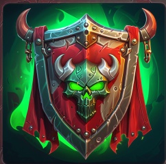 digital game illustration,fantasy,shield,skull,green glow,red cape,metal,horns,brown handles,rivets,sinister,fiery background,high-resolution,detailed texture,digital art,illustration,emblem,dark red tones,gaming icon,glowing eyes,menacing,flag,game asset,,<lora:游戏-000002:0.6>
